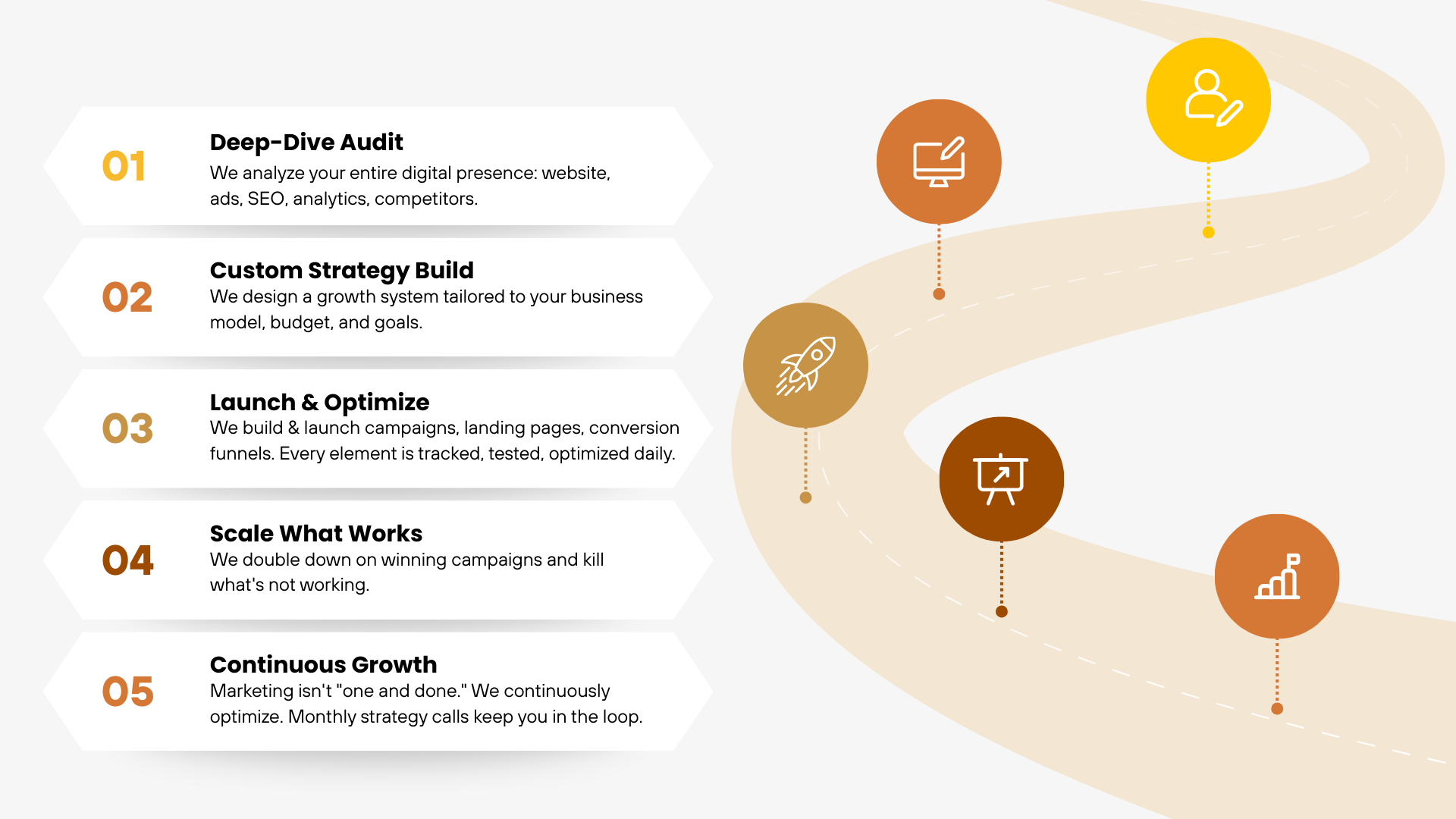 Most agencies focus on traffic. We optimize the entire journey: SEO ? Landing Page ? Lead Nurture ? Sales Close. Every touchpoint is engineered to convert.