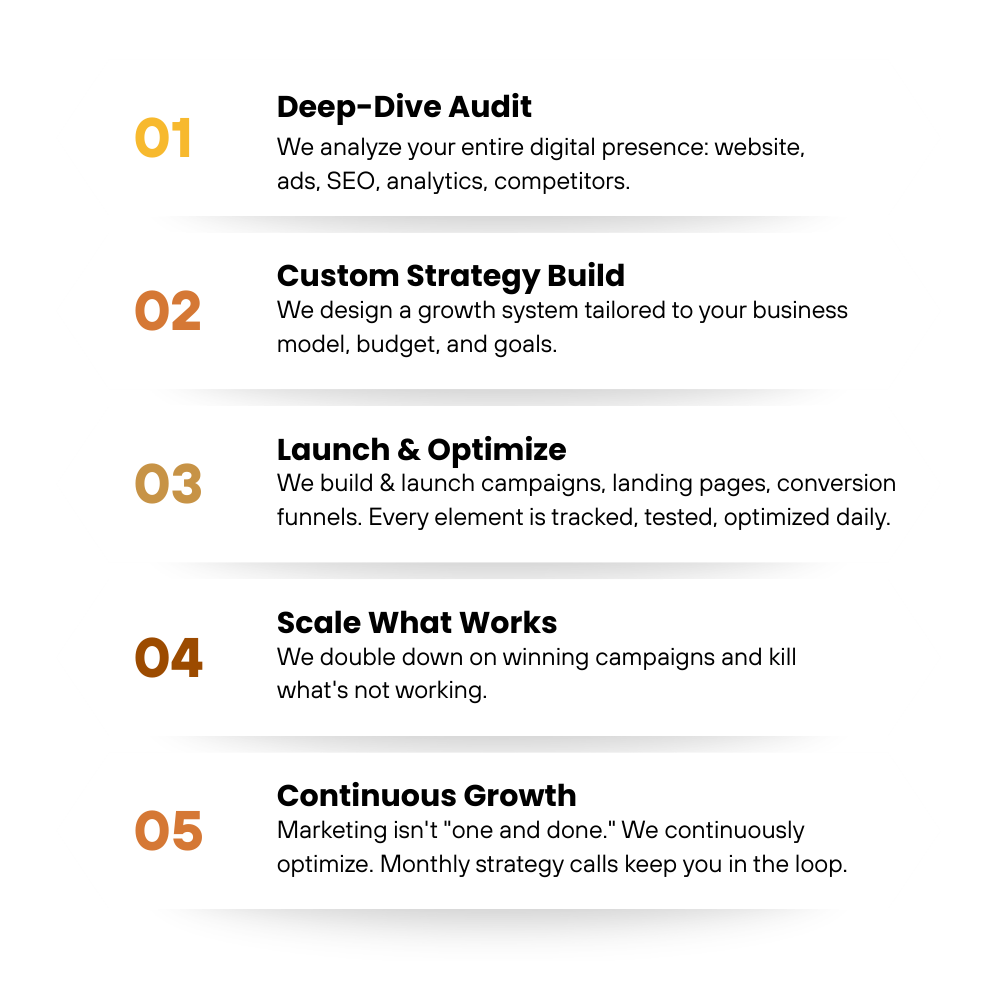 We set clear benchmarks in your strategy call. If we're not hitting targets by day 90, we work for free until we do (see our guarantee).